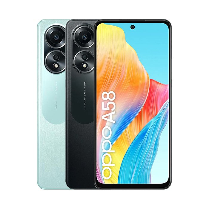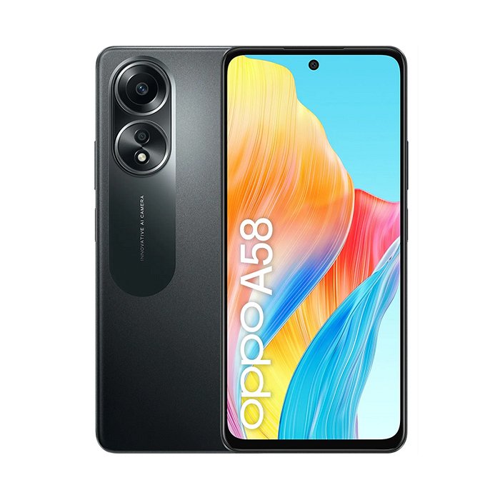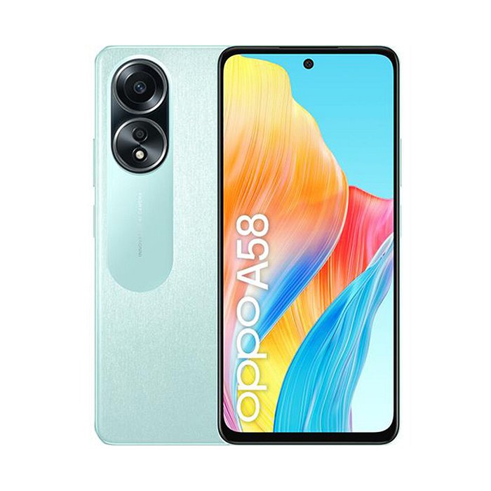 Oppo A58. Dimensioni diagonale schermo: 17,1 cm (6.72"), Risoluzione del display: 2400 x 1080 Pixel. Frequenza del processore: 2 GHz, Famiglia processore: MediaTek, Modello del processore: Helio G85. Capacità della RAM: 6 GB, Tipo di RAM: LPDDR3,Risoluzione fotocamera posteriore (numerico): 50 MP, Tipo di fotocamera posteriore: Doppia fotocamera. Capacità della scheda SIM: Doppia SIM. Sistema operativo incluso: Android. Capacità della batteria: 5000 mAh.